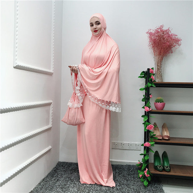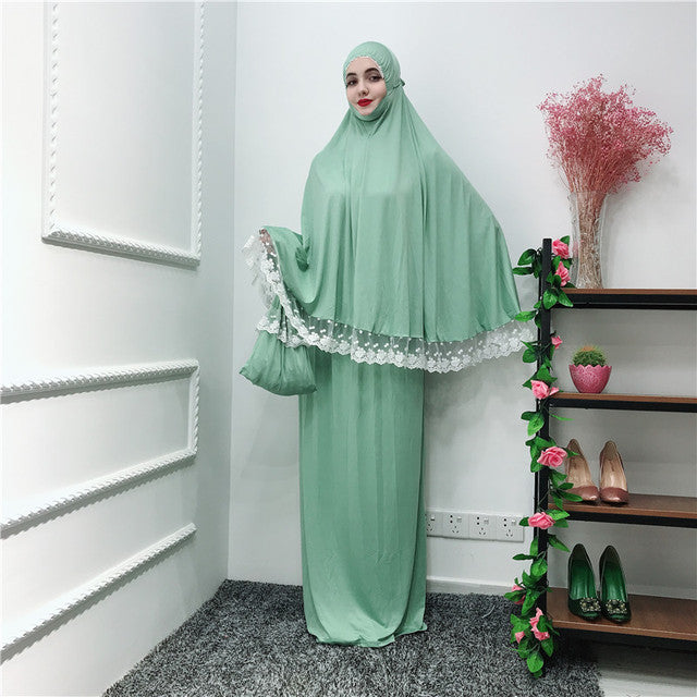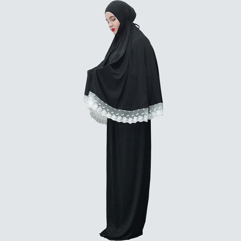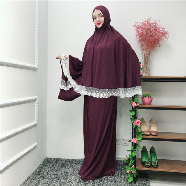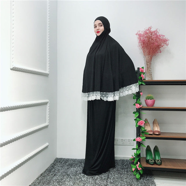 (FR) Lace Trim Two-piece Prayer Outfit Islamic Muslim Set Long Khimar and Skirt Jilbab